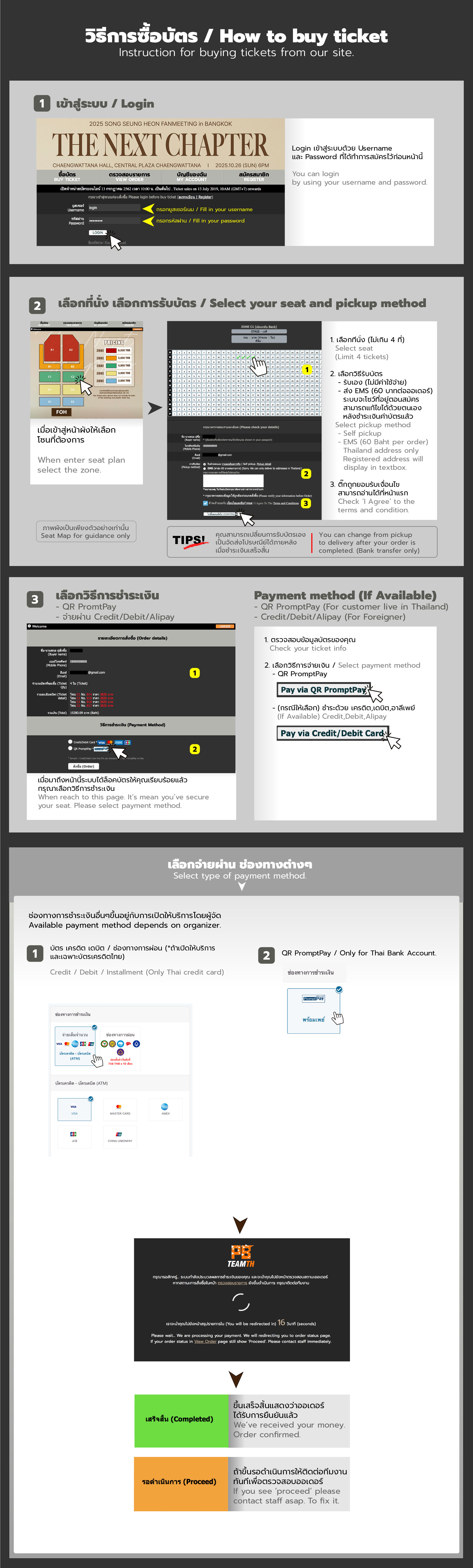 - Before purchased ticket, please recheck no. of tickets carefully because you cannot change after submitted. Payment must be done completely per one order and not allowed to pay specific seating(s). If payment is incomplete or partially amount, system will consider as cancellation. If you want to buy ticket, you can do again with remaining seats next round by selecting ticket same as transferred amount.